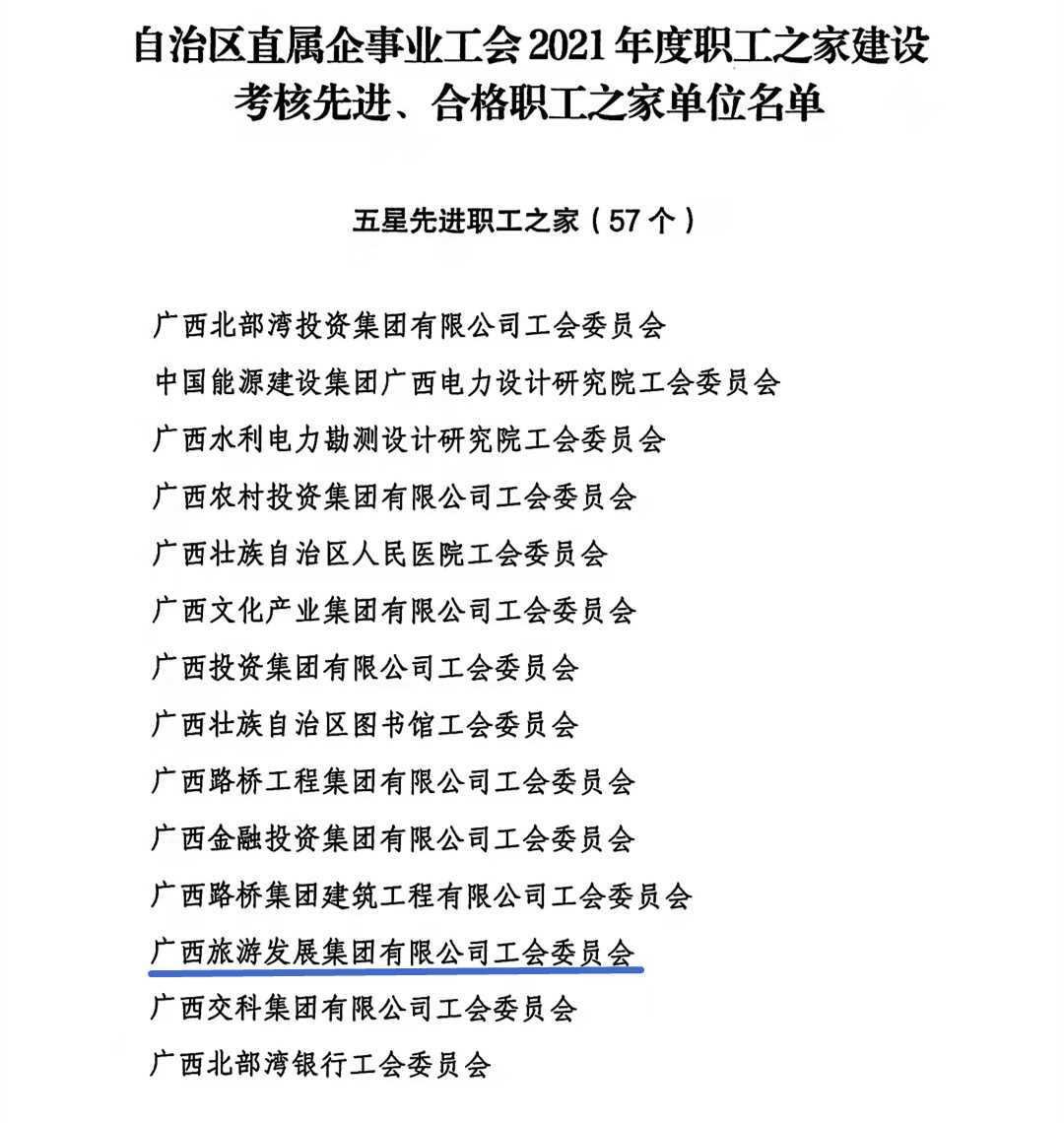 - 3月30日,自治区直属企事业工会下发《关于2021年度职工之家建设考核结果的通报》,广西旅游发展集团工会在2021年度职工之家建设考核中荣获五星先进职工之家称号。2021年,广旅集团工会在集团党委的正确领导和上级工会组织的指导下,紧紧围绕广旅集团年度目标任务,充分发…